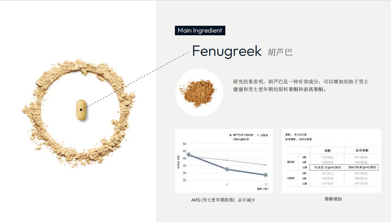 研究结果显示,该产品的主要成分葫芦巴是有助于男性健康、男性更年期的原料,同时里面还增加了睾酮、玻璃睾酮。