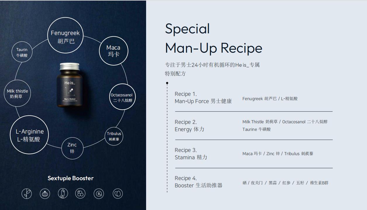 Man's Vitalizer作为高含量、高效率的男性活力剂,致力于一次性管理男性健康、能量、体力等的“复合管理” 将男士所必需的14种成分有效组合。